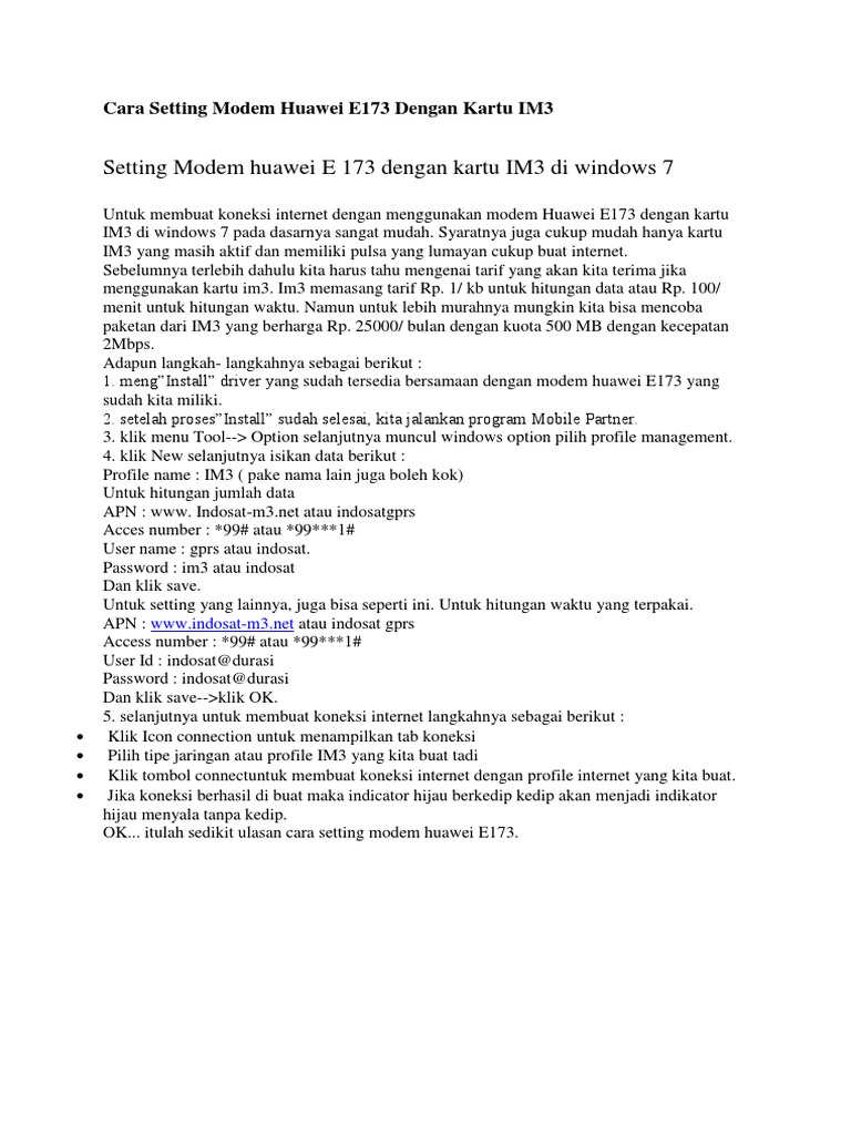 Buka aplikasi mobile partner, lalu klik tool, kemudian klik option. Untuk setting modem dengan kartu 3 sangat gampang……… setting modem menggunakan kartu 3, untuk yang berlangaanan : 0 ratings0% found this document useful (0 votes). Cara pertama setting modem kartu as pada modem huawei, bagi anda yang memiliki modem dengan produk huawei, maka anda bisa mengikuti langkah langkahnya sebagai berikut: Kemarin saya barusan membeli modem baru dengan merk huawei e173 mobinil dengan harga rp.265.000.